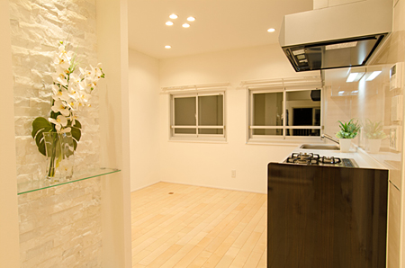 配管を隠し、ニッチスペースに収納を配して、すっきりとおしゃれに。 間接照明を取り入れ、落ち着いた雰囲気に。 掃除のしやすさも考慮した設計。 |