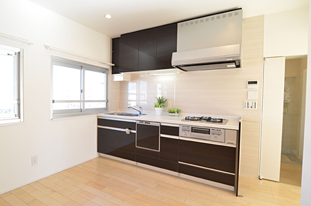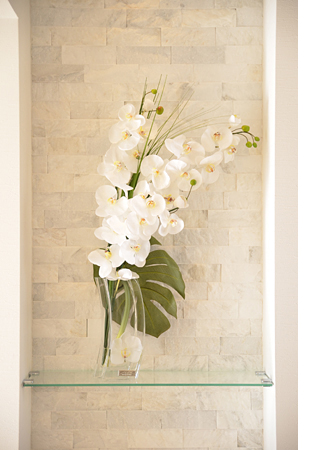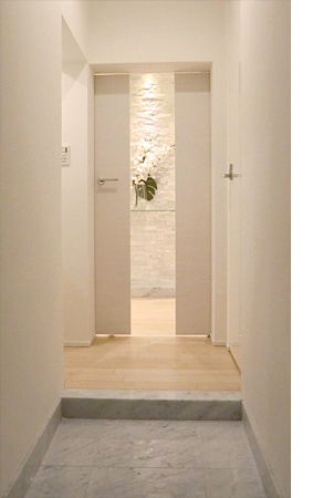 上がって左手に、大きな下駄箱を設置。 たたきに大理石を使用し、高級感のある明るい空間へ。 玄関とキッチンの間にドアを設け、玄関ホールを演出。 ドアのガラススリット越しには、飾り棚が来訪者をお出迎え。 |