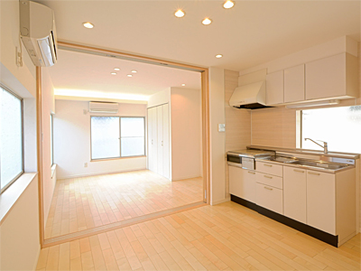 間仕切りを、天井まで高さのある3枚の引き込み戸に換え、