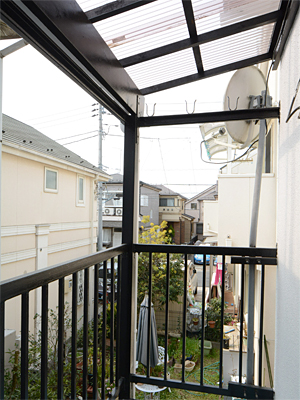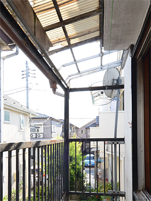 経年劣化で茶色になったヒサシ、錆びついた手すり。
