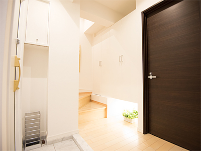 たたきに大理石を採用。大きな吊り上げ下駄箱の下には、