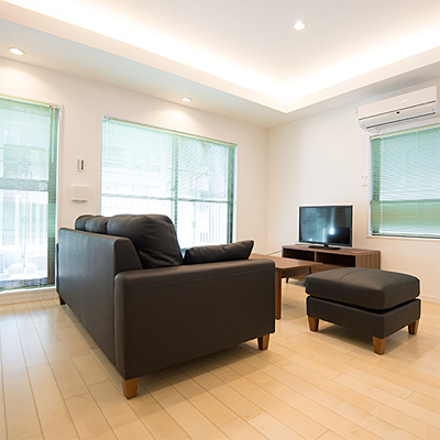 間接照明とダウンライトで天井も広く、くつろげる空間に。